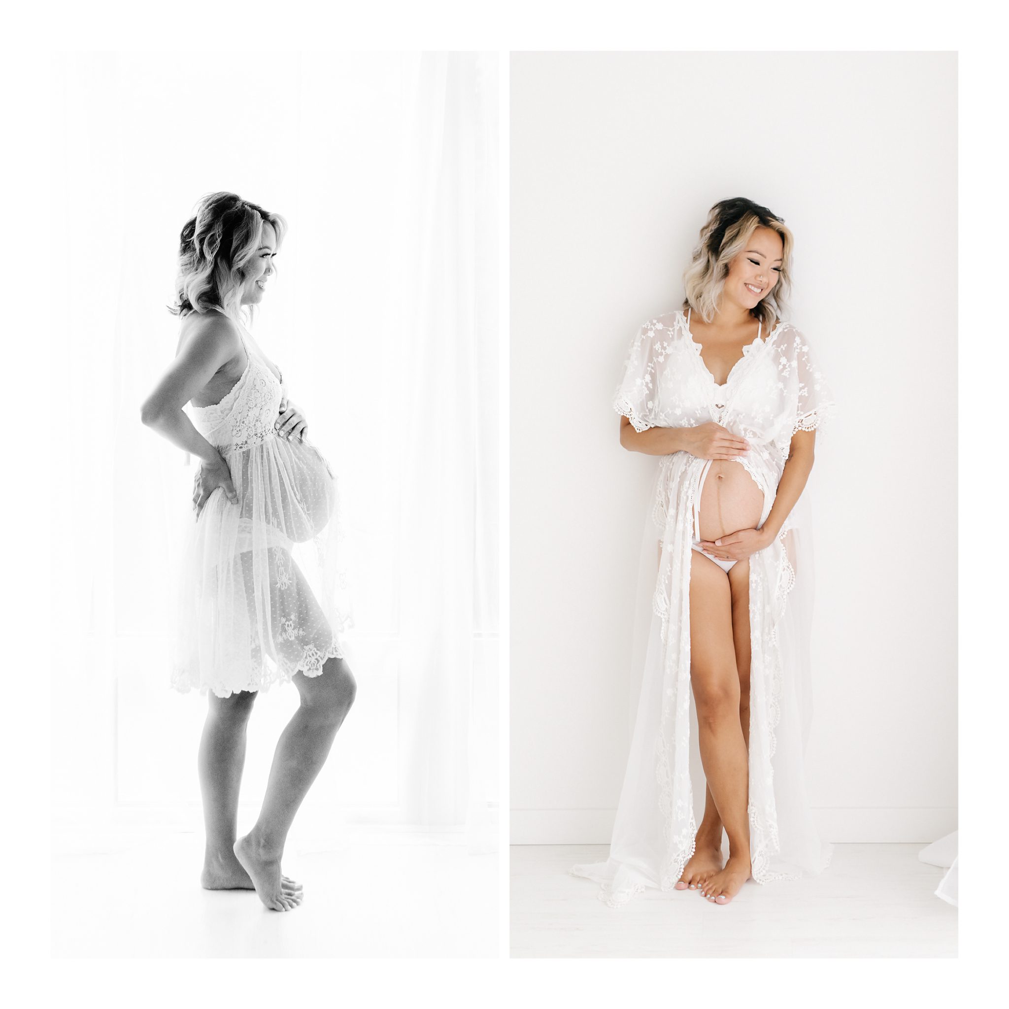 pregnant woman posing in white lace robe and lace slip against a white wall